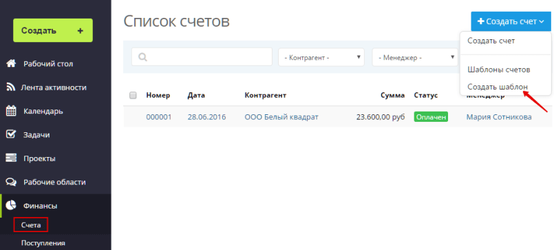 Самая популярная услуга в фирме «Константа» — поддержка сайта. Первый шаблон счета, который создаст Мария будет включать всевозможные позиции именно по этой услуге. Шаблон счета создается в разделе Финансы → Счета, через кнопку в правом верхнем углу «Создать счет». В открывшемся меню нужно выбрать пункт «Создать шаблон».