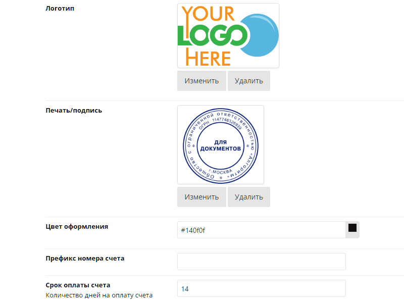 Здесь же загружаем логотип и печать с подписью в форматах jpg или png, настраиваем цвет оформления счета.