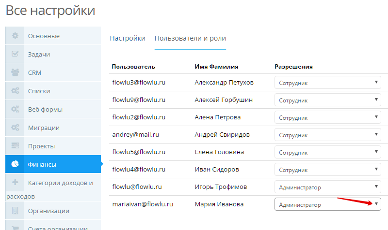 Бухгалтеру Марии он дает доступ «Администратор« к модулю «Финансы». Она будет создавать шаблоны счетов, которые смогут использовать все менеджеры.