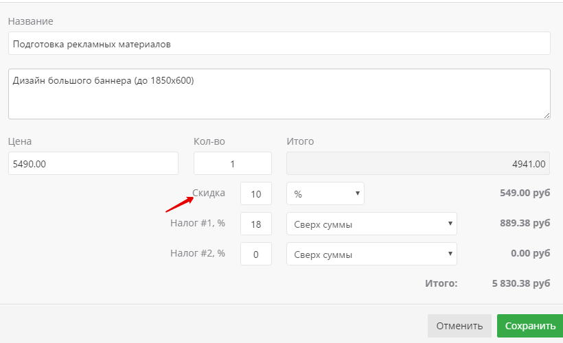 Для каждой позиции можно указать или убрать налог, а также добавить скидку через кнопку «Изменить» . Например, для позиции «Дизайн большого баннера (до 1850 x 600)» весь месяц действует скидка 10%. Мария указывает это. Когда акция закончится, она уберет эту скидку из шаблона счета.